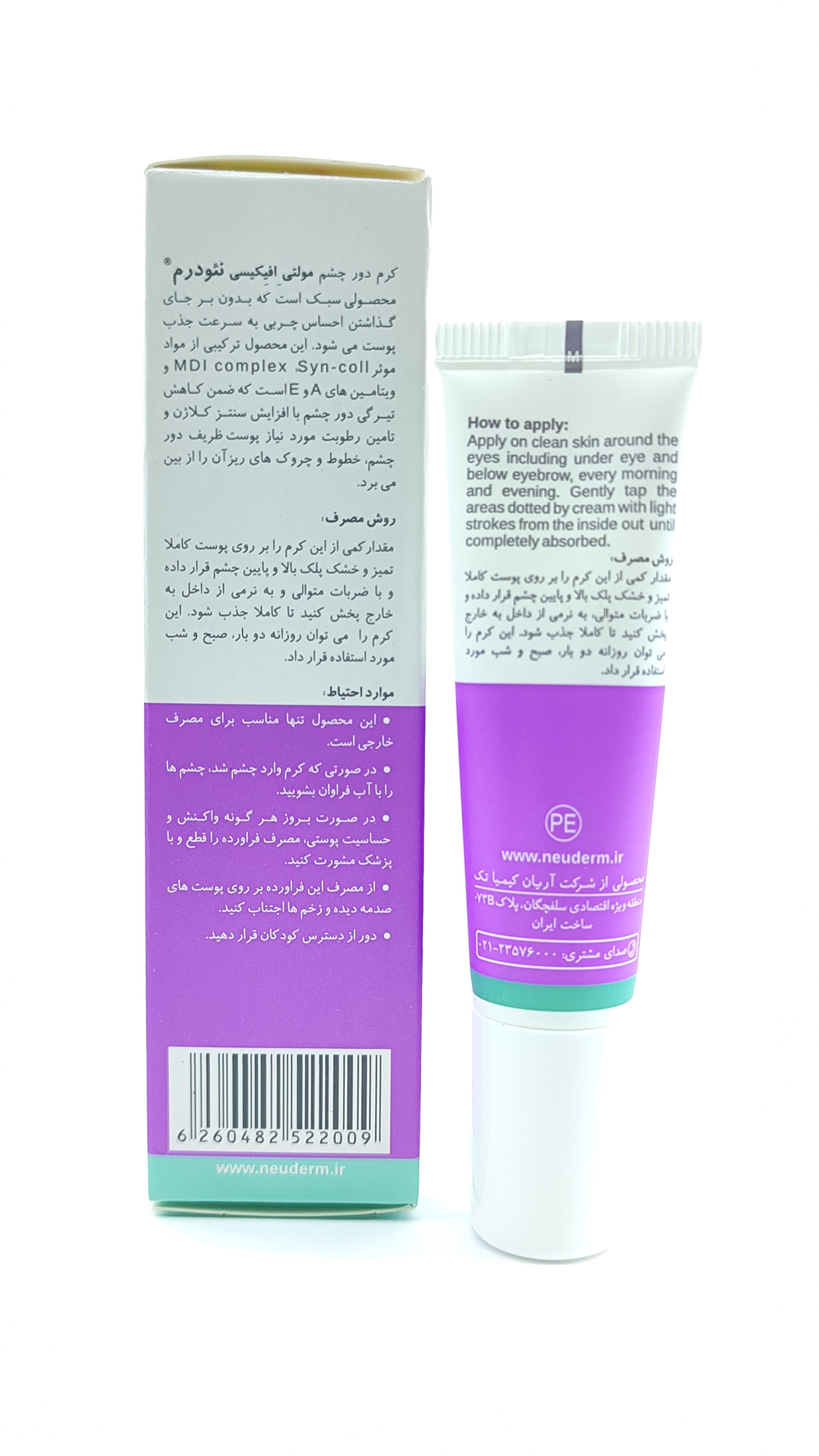 پوست اطراف چشم حساسترین بخش صورت است و عدم مراقبت کافی، به سرعت تحت تاثیر عوامل محیطی قرار گرفته و درگیر مسائلی مانند: چروک، تیرگی و پف میشود. افزایش سن، ژنتیک، نور خورشید و آلودگیهای زیست محیطی اصلیترین عوامل ایجاد چین و چروک است. کرم دور چشم نئودرم مدل Multi Efficacy حجم 15 میلی لیتر، محصولی است که میتواند به صورت همزمان به بسیاری از نیازهای پوست اطراف چشم شما پاسخ دهد. این محصول دارای بافتی سبک است؛ بنابراین پس از استفاده شما احساس سنگینی روی پوست خود نخواهید داشت. این کرم به دلیل داشتن ترکیبات مفید مانند: ویتامین E و A نهتنها باعث کاهش تیرگی پوست اطراف چشم شما میشود؛ بلکه چروک ریز اطراف چشم شما را نیز از بین خواهد برد. با استفاده از این کرم، پوست اطراف چشم شما لطیفتر شده و چهره شما جوانتر و شادابتر خواهد شد.